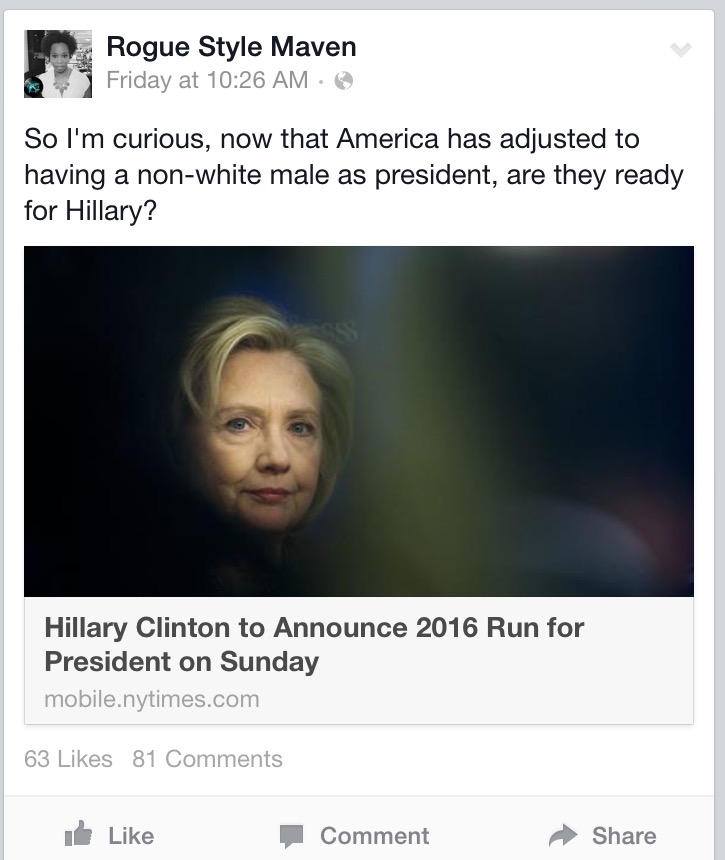 The New York Times posted an article the other day about Hillary Clinton preparing to announce her candidacy for president. I personally love politics, but it is not something I talk about publicly as I know it can be divisive.However, after reading the article I was curious — Is rogue-style-maven-hillary-post-americanAmerica ready for a female president after two terms of Obama, a biracial president? I thought, a simple and non-divisive question for my normal followers, so I posed the question on the Rogue Style Maven Facebook page.  I hella wasn’t prepared for what happened next.